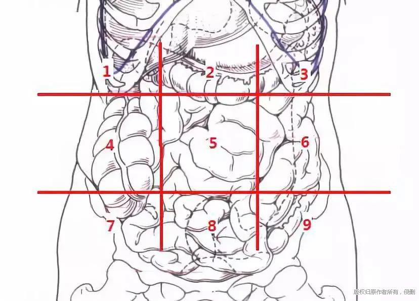 右侧腹部:升结肠、空肠、部分十二指肠等